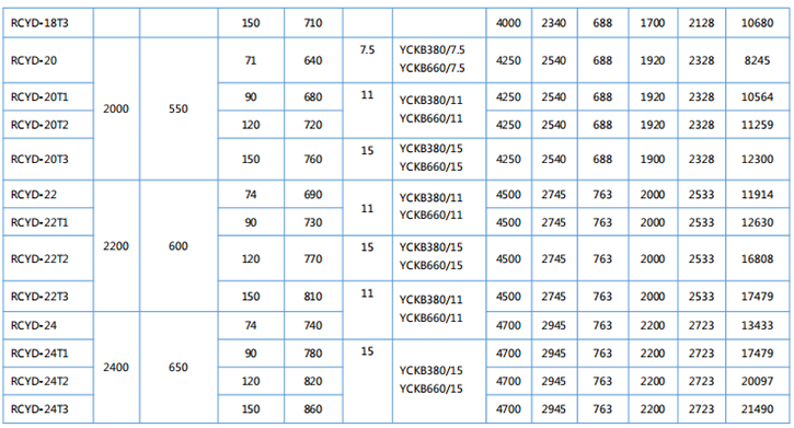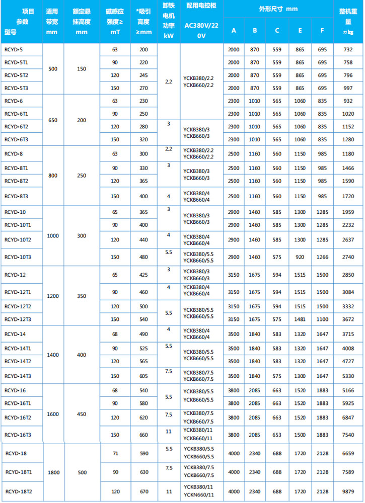 四、RCYD系列懸掛帶式永磁除鐵器主要技術參數、外形尺寸                      執行標準:JB/T8711