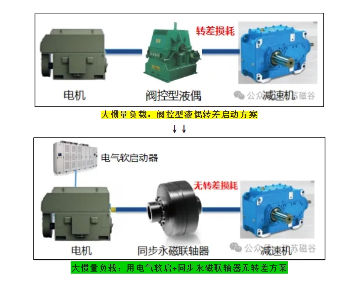 風(fēng)機(jī)水泵平方轉(zhuǎn)矩類用液力偶合器或渦流永磁調(diào)速器調(diào)速,電機(jī)功率1000kW,調(diào)速比i=80%,轉(zhuǎn)差損耗功率= (80%^2 - 80%^3)*1000 = 63.5kW;按年工作8000小時(shí),電費(fèi)0.6元/度計(jì)算,年耗電費(fèi)=63.5*8000*0.6=304800(元) 據(jù)估算,(1) 用于緩沖沖擊保護(hù)配套有阻尼類緩沖液力偶合器每年轉(zhuǎn)差損耗為478億千瓦時(shí);(2) 用于風(fēng)機(jī)、水泵負(fù)載轉(zhuǎn)差調(diào)速過程每年產(chǎn)生的轉(zhuǎn)差損耗為560億千瓦時(shí);合計(jì)轉(zhuǎn)差損耗478+560=1038億千瓦時(shí),占比2022年中國工業(yè)領(lǐng)域電機(jī)總用電量3.98萬億千瓦時(shí)2.68%。相當(dāng)三峽發(fā)電全年的發(fā)電總量。 【解決緩沖轉(zhuǎn)差損耗策略1】 中小轉(zhuǎn)動(dòng)慣量負(fù)載優(yōu)先采用無轉(zhuǎn)差彈性緩沖方式啟動(dòng)和運(yùn)行。