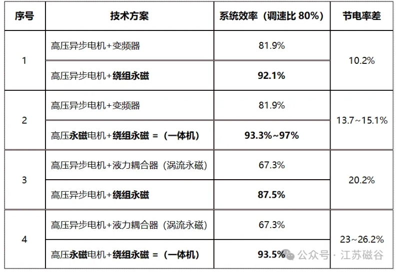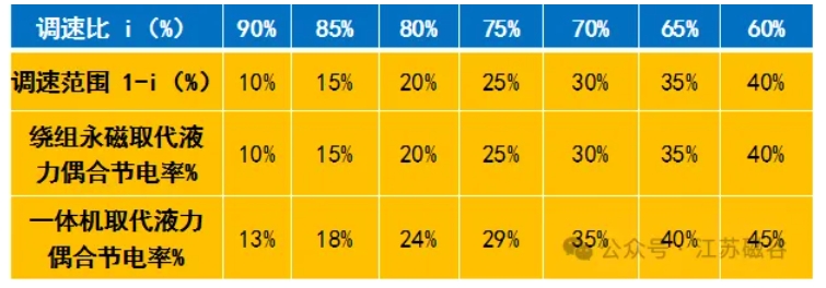 【繞組永磁調(diào)速高節(jié)電性能】 繞組永磁調(diào)速的原理就是將發(fā)熱轉(zhuǎn)差功率用永磁轉(zhuǎn)差發(fā)電技術(shù)來回收轉(zhuǎn)差能量。繞組永磁調(diào)速具有高節(jié)電性能:永磁一體就是將永磁電機(jī)和繞組永磁調(diào)速器嵌套集成的雙永磁調(diào)速電機(jī)。 1)繞組永磁調(diào)速同工況取代液力偶合調(diào)速器節(jié)電率見下表: